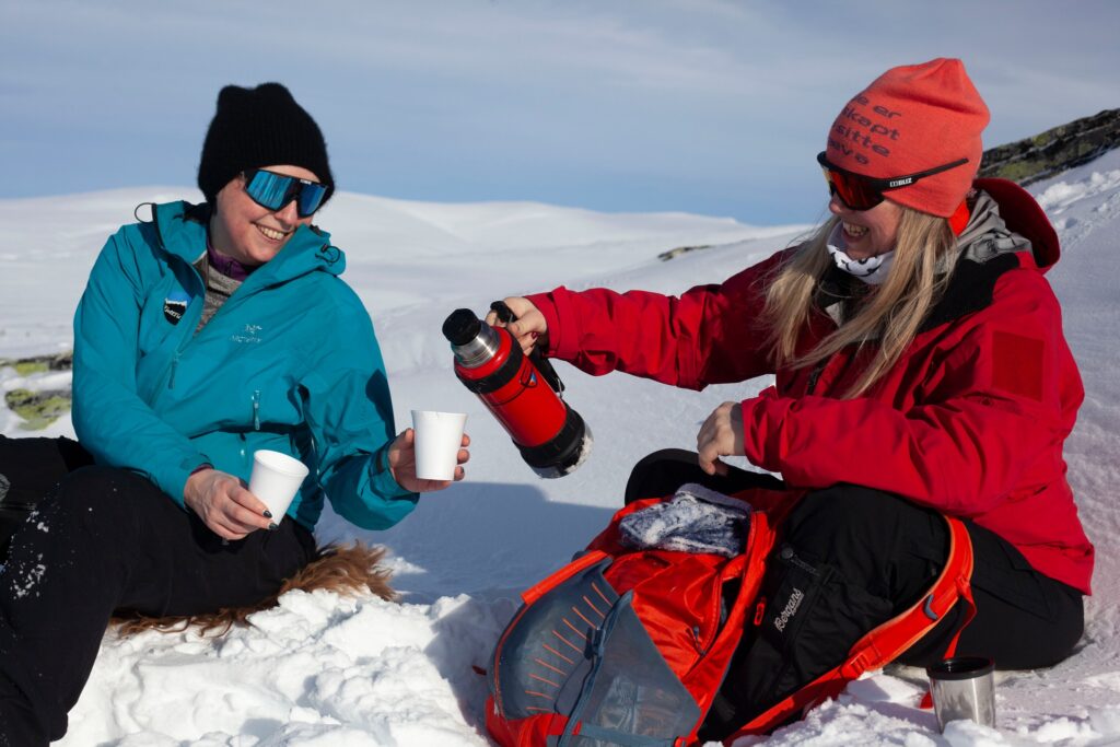 Du møtes rundt en felles aktivitet. Du trenger ikke fylle luften med small talk. Du er ute av den vanlige rollen din. Og du deler noe konkret med noen — en bakke, et utsiktspunkt, en pause med kaffe fra termosen.