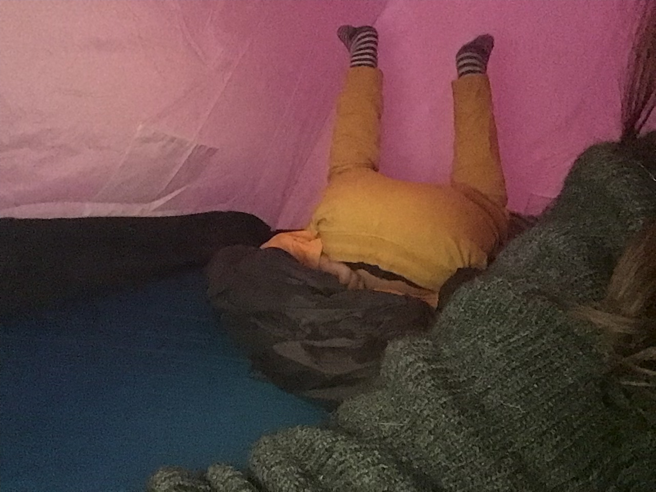 Vi koste oss ved bålet og valgte etter hvert å krype inn i teltet. Og ja, jeg vet: iPad bør begrenses for små barn, men det fungerte ypperlig for å underholde sønnen min i teltet den kvelden. Vi lekte med kamera og lydopptak, og hadde det skikkelig fint.