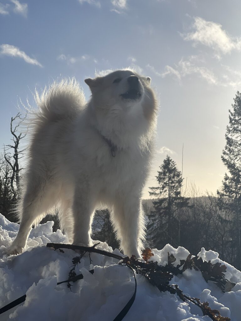 Til slutt fikk vi fyr på bålet. Gutten grillet pølse og koste seg. Ved en anledning fant derimot hunden ut at han skulle gå forbi bålet og dra båndet rett over flammene. Snapp! Så hadde båndet brent tvers av, og hunden var fri.